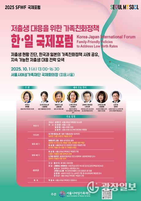광장일보 주리아 기자 | 서울시여성가족재단은 오는 10월 1일 오후 1시부터 4시 30분까지 서울여성플라자 국제회의장에서 '저출생 대응을 위한 가족친화정책 한·일 국제포럼'을 개최한다고 밝혔다.