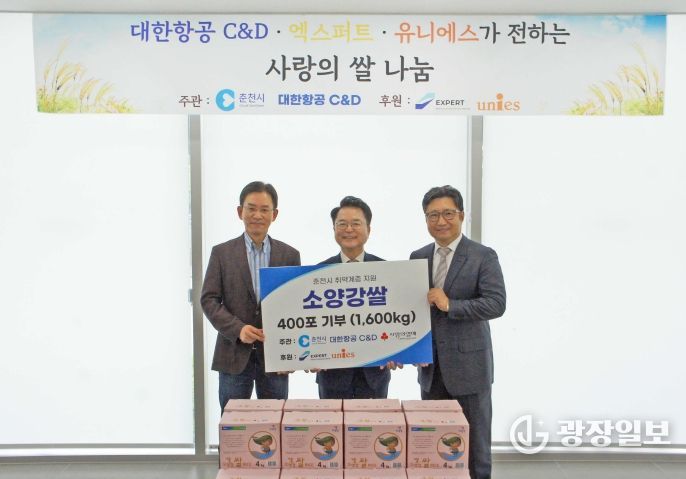이날 전달식에는 최덕진 대한항공C&D서비스 대표, 오상훈 ㈜엑스퍼트 대표가 참석했다. 기부된 쌀은 춘천지역 저소득 가정 등에 전달될 예정이다.