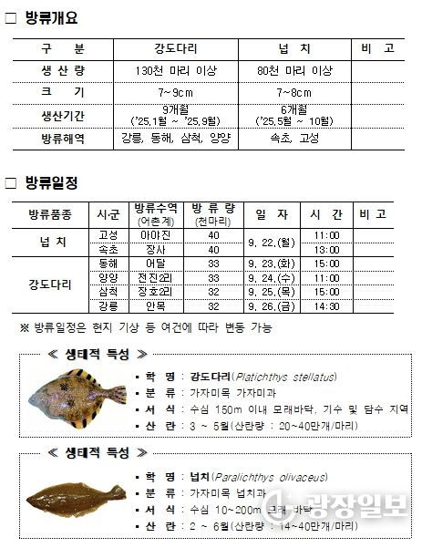 광장일보 이현나 기자 | 강원특별자치도는 9월 22일부터 동해안 6개 시군 연안 해역에 어류 종자 21만 마리를 무상 방류한다고 밝혔다.