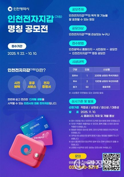 광장일보 주재영 기자 | 인천광역시는 시민들에게 더욱 편리한 디지털 생활을 제공하기 위해 도입하는 블록체인 기반 비대면 공공서비스 앱 ‘인천전자지갑(가칭)’의 명칭 공모전을 9월 22일부터 10월 10일까지 19일간 진행한다고 밝혔다.