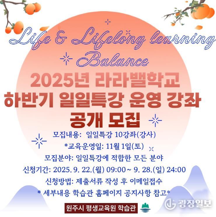 광장일보 이현나 기자 | 원주시 평생교육원 학습관은 9월 22일부터 28일까지 2025년 라라밸학교 하반기 일일특강 운영 강좌(강사)를 모집한다.