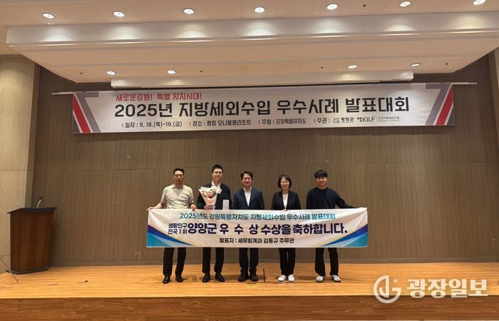 광장일보 이현나 기자 | 양양군은 지난 9월 19일 강원도 평창 모나 용평리조트에서 열린 ‘2025 지방세외수입 우수사례 발표대회’에서 신규수입원발굴 부문 우수상을 수상했다.
