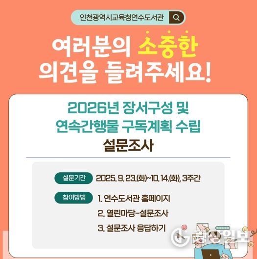 광장일보 주재영 기자 | 인천광역시교육청연수도서관은 9월 23일부터 3주간 ‘2026년 장서 구성 및 연속간행물 구독 계획 수립’을 위한 설문조사를 진행한다.