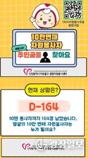 광장일보 주재영 기자 | 인천 미추홀구종합자원봉사센터(센터장 유중형)는 지역 사회 자원봉사 활성화를 위해 ‘10만 번째 자원봉사자를 찾아라!!’ 이벤트를 진행한다고 22일 밝혔다.