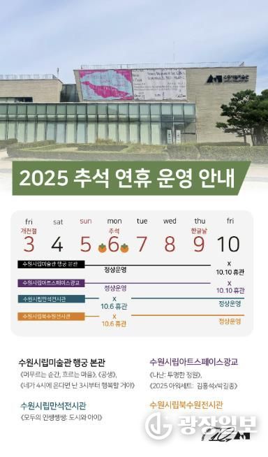수원시립만석전시관과 수원시립북수원전시관은 추석 당일인 10월 6일(월)만 휴관한다. 김지은, 김참새 작가가 참여해 일상적 도시 환경을 새로운 시선으로 관찰하는 참여형 교육 전시 《모두의 인쌩쌩쌩: 도시와 아이》와대관전시《채운민화연구회》, 《강숙란》, 《윤홍주》, 《이연준》전을 관람할 수 있다.