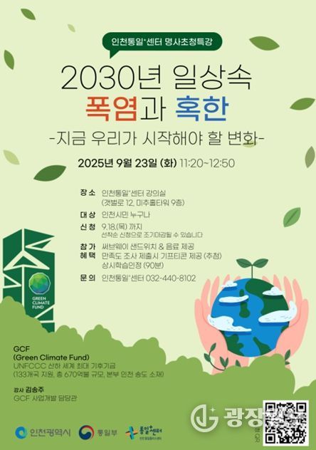 광장일보 주재영 기자 | 인천광역시는 9월 23일 인천통일플러스센터(연수구 송도동 소재)에서 녹색기후기금(GCF)의 전문가를 초청, 기후위기의 심각성과 대응방안을 주제로 하는 특별 강연을 개최했다고 밝혔다.