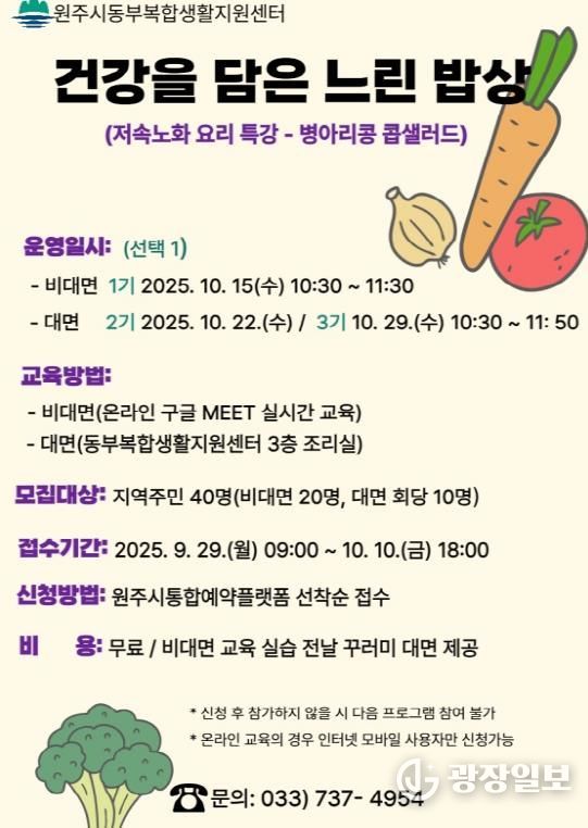 광장일보 이현나 기자 | 원주시동부복합생활지원센터는 오는 29일부터 저속노화 요리 특강 ‘건강을 담은 느린 밥상’ 프로그램 참여자를 모집한다.