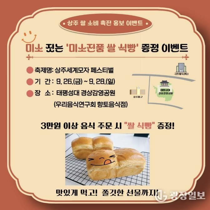 이벤트 행사는 9월 26일부터 9월 28일까지 진행되는 상주세계모자 페스티벌과 10월 18일부터 10월 19일까지 진행되는 상주슬로라이프 페스티벌 두 번에 걸쳐서 추진할 계획이다. 행사 장소는 축제장 내 우리음식연구회 향토음식 판매부스며, 3만원 이상 주문 시 ‘미소진품 쌀 식빵’을 축제기간 중 매일 50개씩 총 250개를 선착순으로 무료 증정할 예정이다.