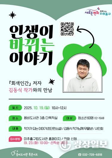 광장일보 주재영 기자 | 인천 미추홀구 용비도서관은 오는 10월 19일 청소년을 위한 특별한 북콘서트 ‘인생이 바뀌는 이야기’를 개최한다.