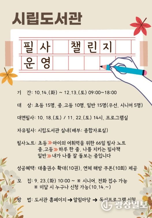 광장일보 이현나 기자 | 태백시는 태백시립도서관에서 오는 10월 14일부터 12월 13일까지(운영시간 09:00~18:00) ‘필사 챌린지’를 운영한다고 밝혔다.