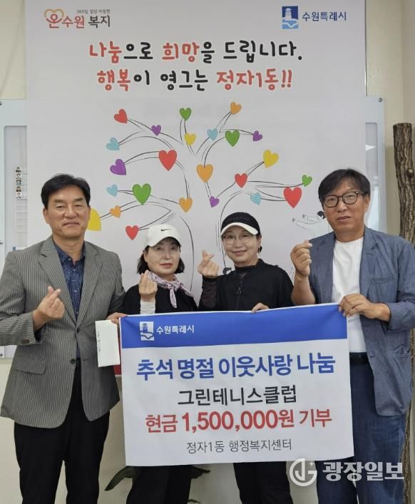 광장일보 나학천 기자 | 수원시 장안구 정자1동은 그린테니스클럽이 지난 23일, 추석 명절을 맞아 관내 취약계층을 돕기 위해 현금 150만 원을 기부했다고 밝혔다.