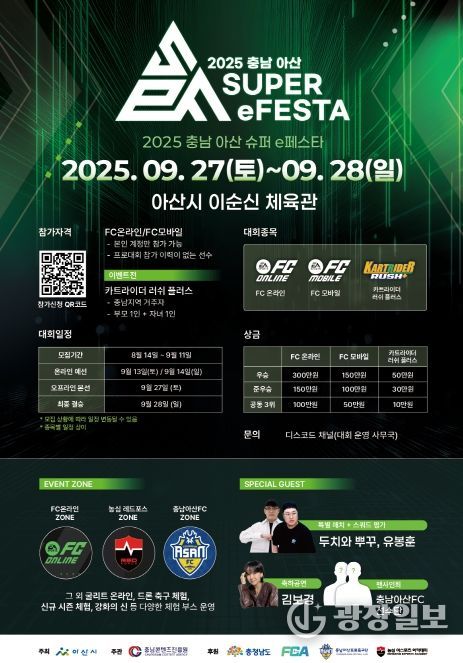 또한, 아산시 출신이자 올해 5월 아산시 홍보대사로 위촉된 가수 ‘김보경’의 축하 공연을 시작으로 FC 온라인 인기 인플루언서인 ‘두치와뿌꾸(안태은)’과 ‘유봉훈(유정훈)’, 충남아산FC 선수단들이 대회 현장을 찾아 이벤트 매치, 팬사인회, FC온라인 유저 스쿼드 평가 등 다양한 프로그램으로 현장 관람객들과 소통할 예정이다.