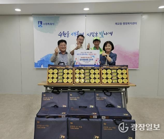 광장일보 나학천 기자 | 수원시 팔달구 매교동 관내 청소업체인 ㈜대일실업은 지난 22일 수원시 팔달구 매교동행정복지센터에 관내 어려운 이웃에게 100만원 상당의 추석명절 참치햄 선물세트 30개를 기부하여 따뜻한 이웃 나눔을 실천했다.