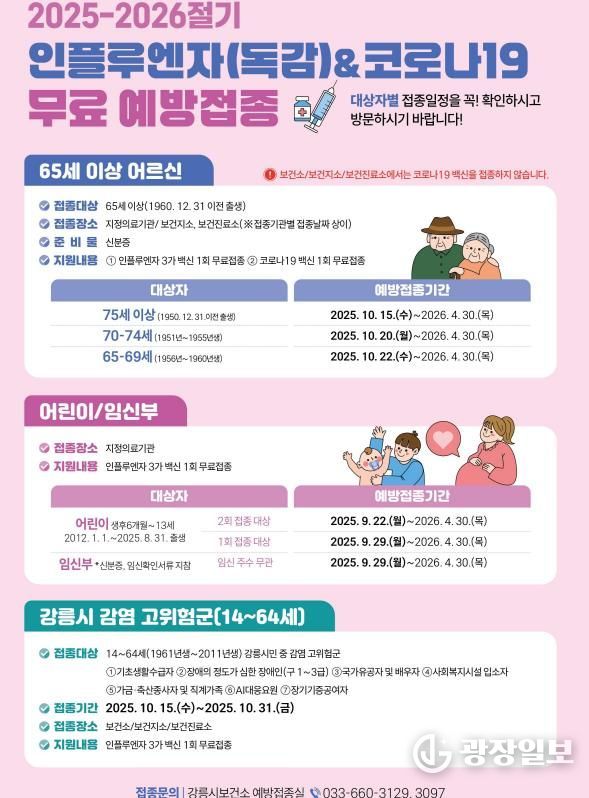 광장일보 이현나 기자 | 강릉시는 겨울철 호흡기 감염병 예방을 위해 오는 9월 22일부터 2025-2026절기 독감 및 코로나19 무료 예방접종을 실시한다고 밝혔다.