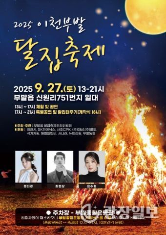 광장일보 주재영 기자 | 이천시 부발읍은 오는 9월 27일 13시부터 신원리 복하천 변에서(부발읍 신원리 751번지 일원) 다양한 체험 및 공연, 달집태우기, 초청 가수 축하공연 등 다양한 볼거리가 있는 ‘2025 이천 부발 달집축제’를 개최한다고 밝혔다.