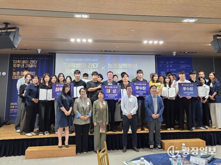 광장일보 주재영 기자 | 천안시는 24일 라마다앙코르에서 농촌마을만들기 아이디어 공모전 ‘대학생이 간다’ 공모전 시상식 및 10주년 기념식을 개최했다.