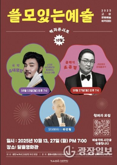 광장일보 이현나 기자 | 고성문화재단(이사장 함명준)은 10월 '쓸모있는 예술' 렉쳐콘서트 참여자를 모집한다. 지난 9월 연극·가드닝·미술을 주제로 다채로운 무대를 선보인 데 이어, 이번에는 국악과 클래식이라는 두 장르를 통해 군민에게 한층 풍성한 문화 향유의 기회를 제공할 예정이다.
