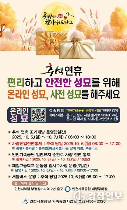 기타 차량 진입 통제 등 성묘 종합대책 관련 문의 사항은 인천시설공단 가족공원사업단으로 문의하면 된다.