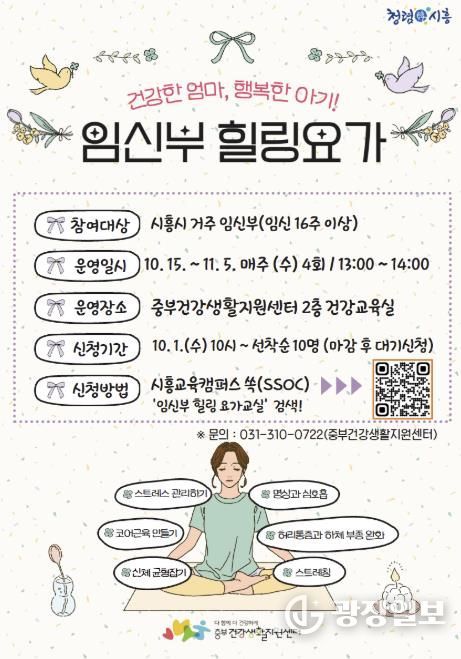 광장일보 이현나 기자 | 시흥시보건소 중부건강생활지원센터는 임신부의 신체적ㆍ정신적 건강 증진을 위해 오는 10월 15일부터 11월 5일까지 ‘임신부 힐링 요가교실’을 운영한다. 대상은 관내 임신 16주 이상 임신부로, 선착순 10명을 모집한다.