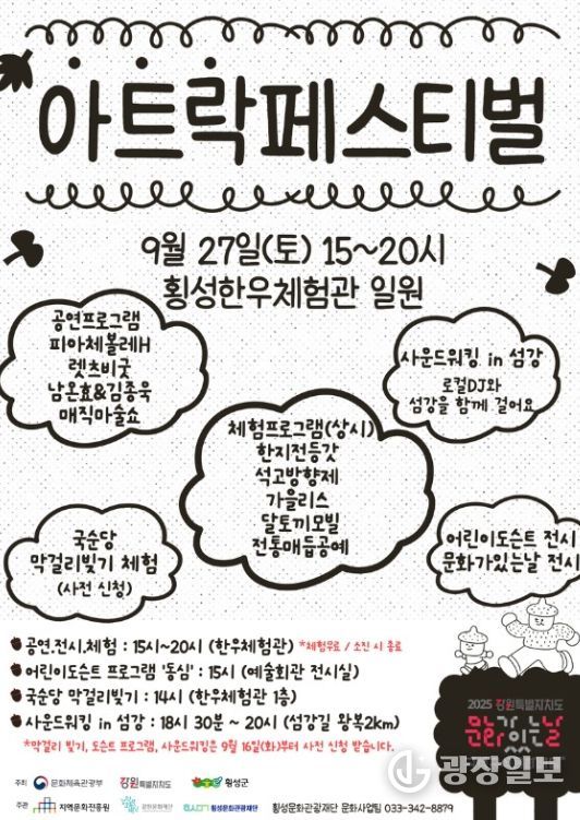 광장일보 이현나 기자 | 횡성문화관광재단은 ‘2025 문화가있는날-아트락페스티벌’을 오는 9월 27일 오후 3시부터 8시까지 횡성한우체험관 일원에서 개최한다고 밝혔다.