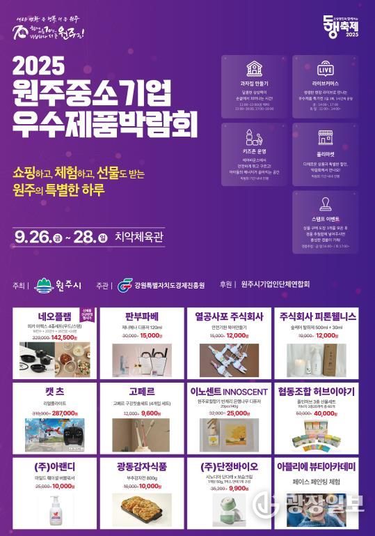 광장일보 이현나 기자 | 원주시가 주최하고 강원특별자치도경제진흥원이 주관하는 ‘2025 원주 중소기업 우수제품 박람회’가 오는 26일 오전 10시 30분, 치악체육관 무대에서 개막식을 열고 28일까지 3일간 이어지는 행사의 막을 올린다.