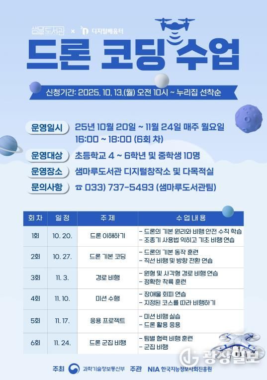 광장일보 이현나 기자 | 원주시 샘마루도서관은 과학기술정보통신부가 주최하고 한국지능 정보사회진흥원에서 주관하는 ‘디지털 역량 강화 교육: 드론 코딩 수업’을 10월 20일부터 11월 24일까지 운영한다.