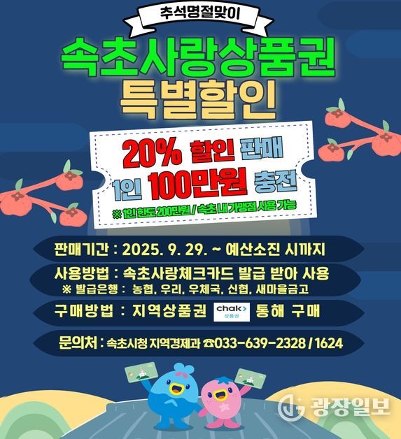 광장일보 이현나 기자 | 속초시가 추석 명절을 맞아 지역경제 활력 제고와 시민들의 장보기 부담을 덜기 위해 총 46억 원 규모의 ‘속초사랑상품권’을 발행한다.