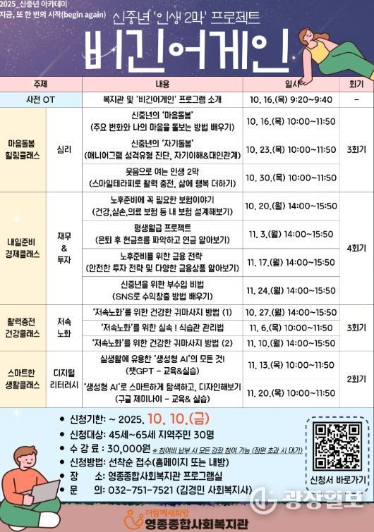복지관 관계자는 “이번 프로그램은 경제, 건강, 정서, 디지털 역량 등 다양한 분야의 강좌로 신중년의 인생 재도약을 도울 것”이라며 “새로운 인생 설계를 희망하는 주민들의 많은 관심과 참여를 바란다”라고 밝혔다.