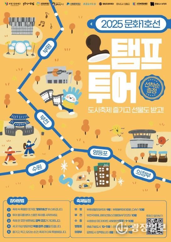 광장일보 나학천 기자 | 수원문화재단은 수도권 1호선 라인을 따라 펼쳐지는 특별한 문화여행,‘문화 1호선 스탬프 투어’를 오는 9월부터 11월까지 부평, 부천, 영등포, 수원, 의정부 5개 법정문화도시 축제 현장에서 운영한다고 밝혔다.