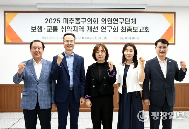 광장일보 주재영 기자 | 인천광역시 미추홀구의회 의원연구단체 '보행·교통 취약지역 개선 연구회'(대표의원 박수연, 연구의원 장규철·배상록·김태계)가 2025년 9월 24일 미추홀구의회 세미나실에서 연구용역 최종보고회를 개최하고 성공적으로 마무리했다.