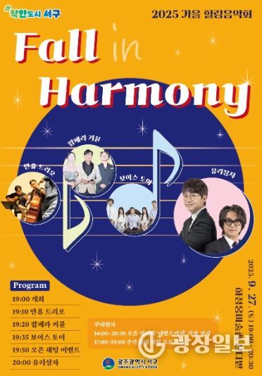 광장일보 주재영 기자 | 광주광역시 서구는 오는 27일 오후 7시 농성동 하정웅미술관 앞 잔디광장에서 ‘2025 가을 힐링음악회 – 폴 인 하모니(Fall in Harmony)’를 개최한다.