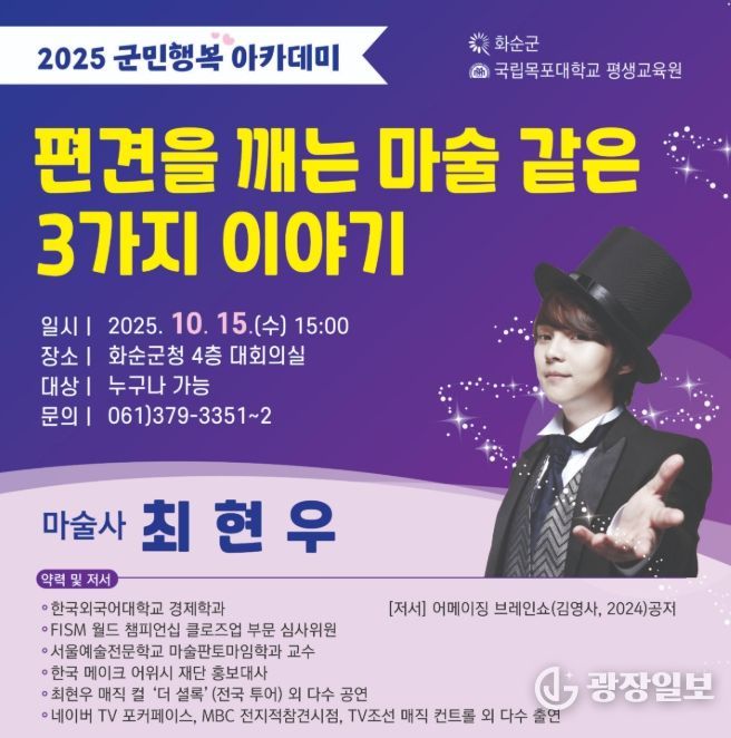 광장일보 주재영 기자 | 화순군은 오는 10월 15일 수요일 오후 3시, 화순군청 4층 대회의실에서 '2025 군민행복 아카데미 8회차 강연을 개최한다고 밝혔다.