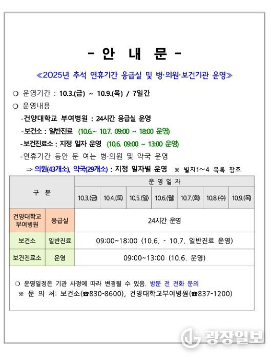 연휴 기간에는 지역응급의료기관인 건양대학교 부여병원 응급실이 24시간 운영되며, 관내 병의원 43개소와 약국 29개소를 ‘문 여는 병의원과 약국’으로 지정·운영하여 진료 공백을 최소화할 계획이다.