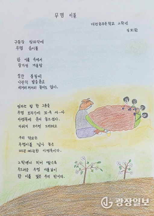 수상자 김희환 씨는 “예전에는 글로 표현하는 것이 낯설고 어려웠지만, 이제는 시를 통해 나의 기억과 마음을 꺼내 볼 수 있어 세상이 다르게 느껴진다”며 “따뜻한 아랫목처럼 품어준 대전늘푸른학교, 친절하게 가르쳐주신 선생님들, 함께 배우며 힘이 되어준 학우들과 수상의 기쁨을 나누고 싶다”고 소감을 전했다.