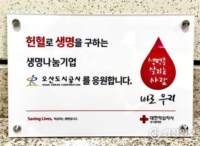 광장일보 나병석 기자 | 오산도시공사는 지난 25일 대한적십자사 경기혈액원으로부터 ‘생명나눔기업’으로 선정되어 현판식을 진행했다고 밝혔다.