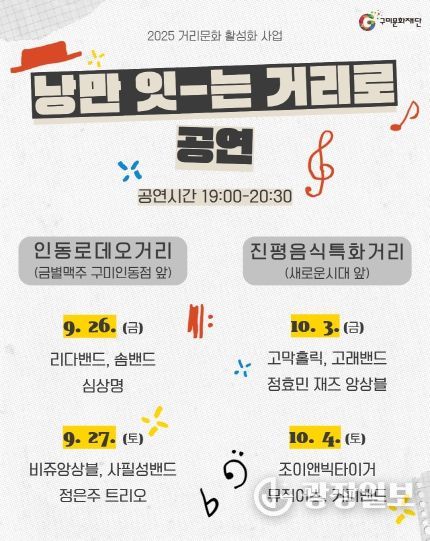 9월 26일·27일, 10월 3일·4일 총 4회 열리는 ‘로데오거리‧진평음식특화거리 활성화 공연’은 추석 연휴에 맞춰 시민과 귀성객이 함께 즐길 수 있는 열린 무대로 마련된다. 오후 7시에 시작되는 이번 공연은 ▲리다와 솜밴드, 심상명밴드가 해금·생황·카혼·기타 등 다양한 악기로 독창적인 무대를 선사하는 1회차(9. 26. 인동로데오거리), ▲비쥬앙상블, 사필성밴드, 정은주 트리오가 앙상블 연주와 재즈의 매력을 전하는 2회차(9. 27. 인동로데오거리), ▲고막홀릭, 고래밴드, 정효민 재즈 앙상블이 가을밤을 재즈 선율로 물들이는 3회차(10. 3. 진평음식특화거리), ▲조이앤빅타이거, 뮤직어스, 커피밴드가 거리를 열정과 낭만으로 채우는 4회차(10. 4. 진평음식특화거리) 공연으로 구성된다. ‘문화가 스며드는 거리’라는 콘셉트 아래 거리를 공연장으로 바꿔 새로운 문화 경험을 시민들에게 선사한다.
