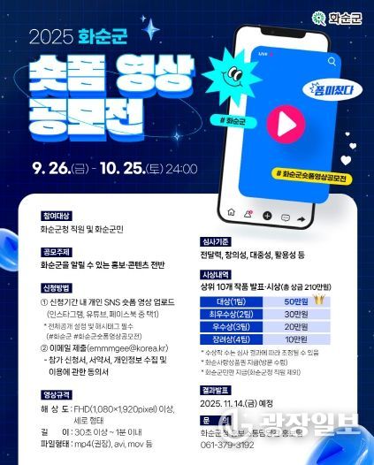 광장일보 주재영 기자 | 화순군은 26일 최신 영상 트렌드인 ‘숏폼(short-form)’을 활용해 군민과 공직자의 자발적인 참여를 유도하고, 지역 홍보 역량을 강화하고자 '2025 화순군 숏폼 영상 공모전'을 개최한다고 밝혔다.