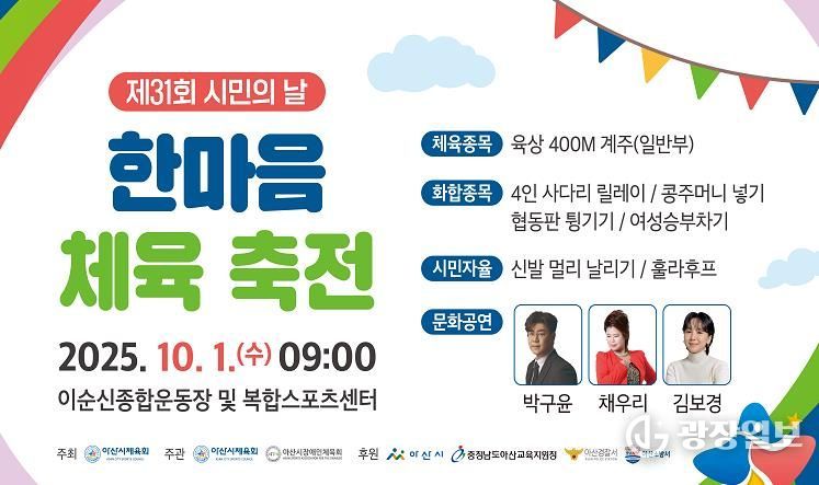 광장일보 주재영 기자 | 아산시는 오는 10월 1일 이순신종합운동장에서 ‘제31회 시민의 날 한마음 체육축전’을 개최한다.