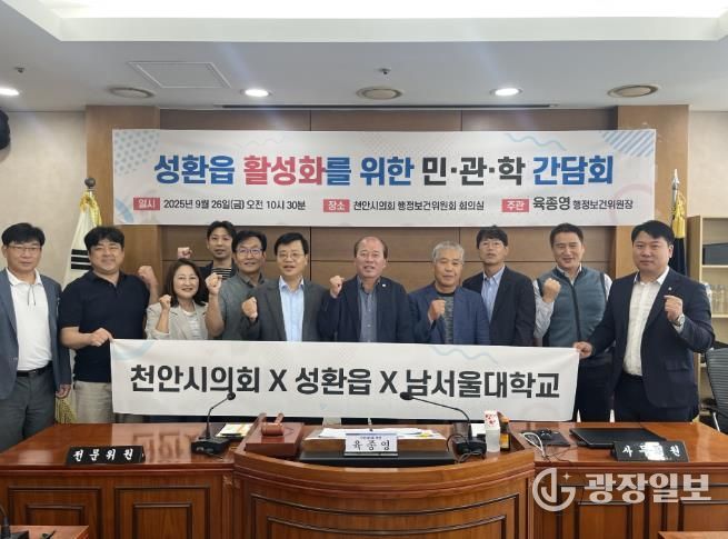 광장일보 주재영 기자 | 천안시의회 육종영 행정보건위원장은 26일 ‘성환읍 활성화를 위한 민·관·학 간담회’를 주재하고, 성환 도시재생혁신지구 지정 이후의 현황과 발전 전략을 공유하는 한편 지역대학 연계 사업과 민·관·학 거버넌스 강화 방안을 논의했다.