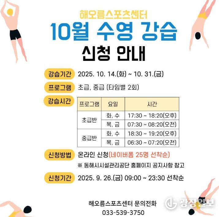 9월 강습이 조기 마감된 데 이어, 10월 강습 접수는 9월 26일 오전 9시부터 동해시시설관리공단 홈페이지에 안내되는 네이버 폼 링크를 통해 선착순으로 진행될 예정이다.