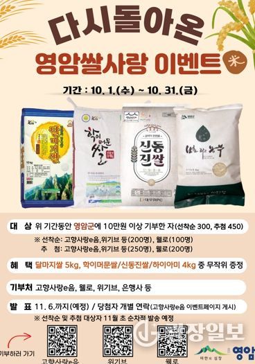 이영주 영암군 홍보전략실장은 “이번 이벤트를 통해 기부자분들께 영암 대표 쌀을 선물로 드리고, 동시에 지역 농가에도 활력을 불어 넣겠다”고 밝혔다.