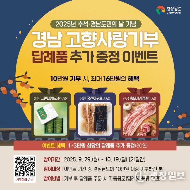 광장일보 주재영 기자 | 경상남도는 추석과 ‘경남도민의 날’(10월 14일)을 맞아, 고향사랑기부제 참여 분위기를 확산시키기 위한 홍보 활동과 경품 이벤트를 추진한다.