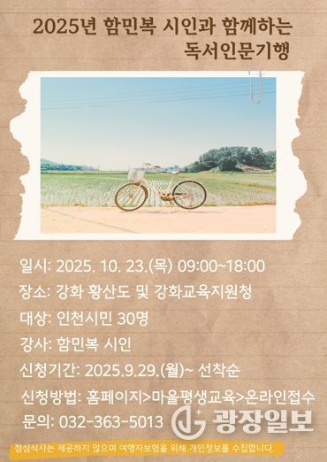 광장일보 주재영 기자 | 인천광역시교육청신트리도서관은 10월 23일 인천시민을 대상으로 ‘함민복 시인과 함께하는 독서인문기행’을 운영한다.