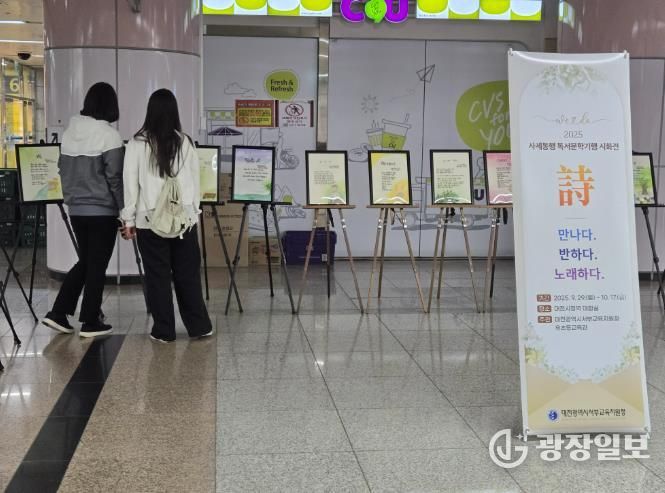 광장일보 이현나 기자 | 대전서부교육지원청은 9월 29일부터 10월 17일까지 대전시청역 대합실(대전 서구 둔산중로 55)에서 2025학년도 사제동행 독서문학기행 참가자 28명의 시화 작품 전시회 '詩-만나다. 반하다. 노래하다.'