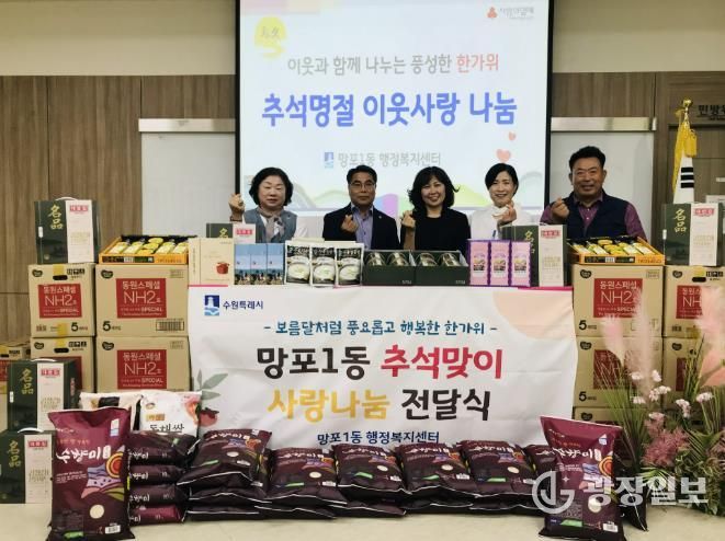 한편, 망포1동은 70세 이상 저소득 노인에게는 상품권 3만원을 기초생활수급, 한부모가족에게는 화장지, 백미, 식품 선물세트, 장학금 등의 후원 물품을 전달할 예정이다.