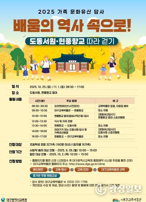 9월 29일부터 대구교육박물관 누리집을 통해 회차별 16가족을 모집하며, 기타 궁금한 사항은 교육학예부로 문의하면 된다.