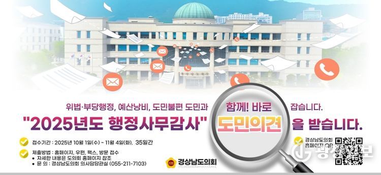 광장일보 주재영 기자 | 경상남도의회는 11월 5일부터 18일, 14일간 예정되어 있는 ‘2025년도 행정사무감사’를 앞두고 도민의 의견을 받는다고 밝혔다.