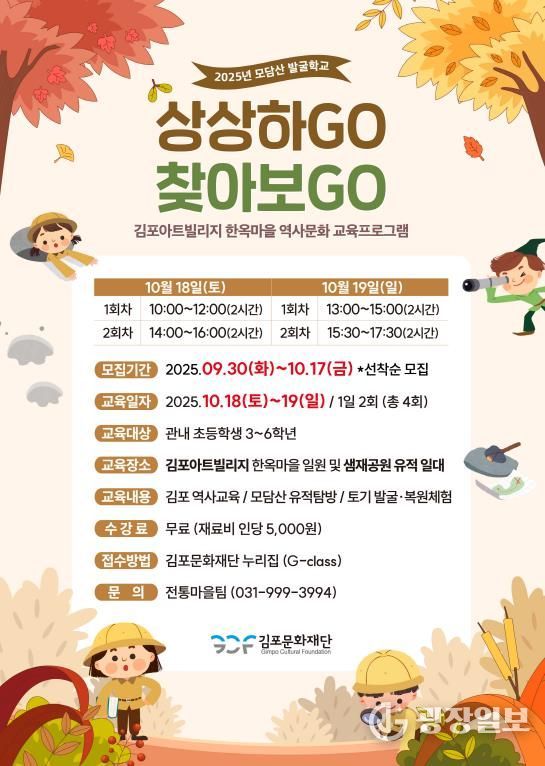 광장일보 이현나 기자 | (재)김포문화재단은 10월 18일과 19일 양일간 김포아트빌리지 한옥마을에서 초등학생을 대상으로 하는 역사문화 교육프로그램 ‘모담산 발굴학교’를 운영한다고 밝혔다.