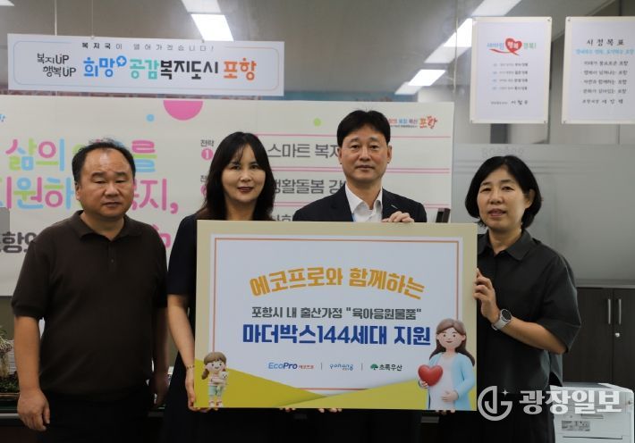 광장일보 주재영 기자 | 포항시는 지난 25일 에코프로가 시청을 방문해 저출산 극복에 힘을 보태고, 지역 내 저소득 출산 가정을 지원하기 위해 ‘마더박스’ 144세트(3,600만 원 상당)를 기탁했다고 밝혔다.