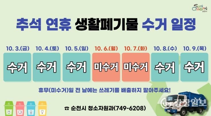 광장일보 주재영 기자 | 순천시는 추석 연휴 기간 생활폐기물로 인한 시민 불편을 최소화하고, 쾌적한 도시 환경을 조성하기 위해 ‘추석 연휴 생활폐기물 수집․운반’을 안정적으로 추진한다.